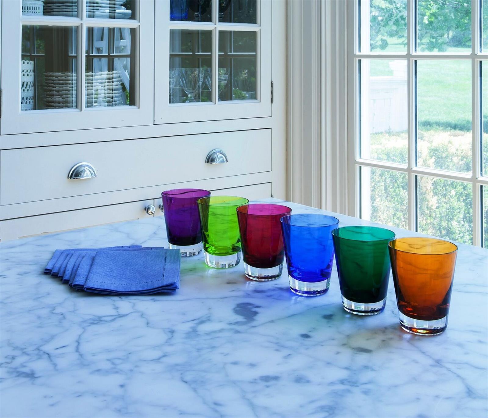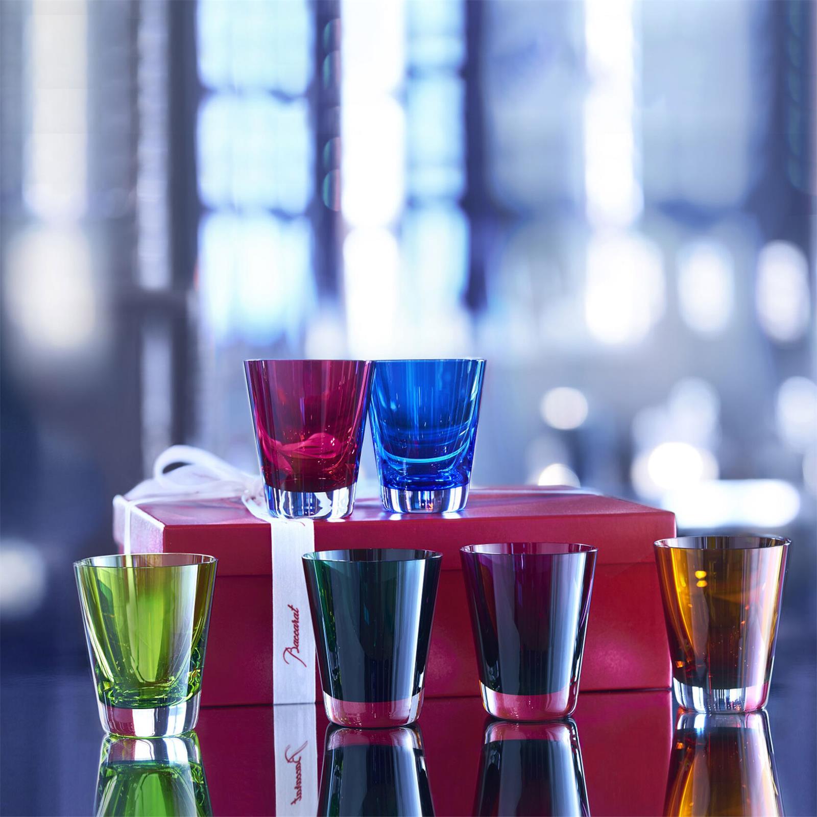 Handcrafted using traditional glassblowing techniques, these glasses are the perfect gift! Available in a set of 6 in 6 different colors. The tableware has a simple silhouette that is precise and elegant. The understated shape of the tumblers makes their use appropriate for any and all drinking experiences: as a water or fruit juice glass, or mixed in with Baccarat clear crystal bar sets. The hand-blown Mosaique tumblers are cased in clear crystal, and are available in a vast array of cheerful colors in this set: orange, blue, purple, moss, green, and Baccarat’s signature ruby red crystal. The interplay of light with the smooth surface and the colored crystal makes for a radiant table, and a compelling soiree.