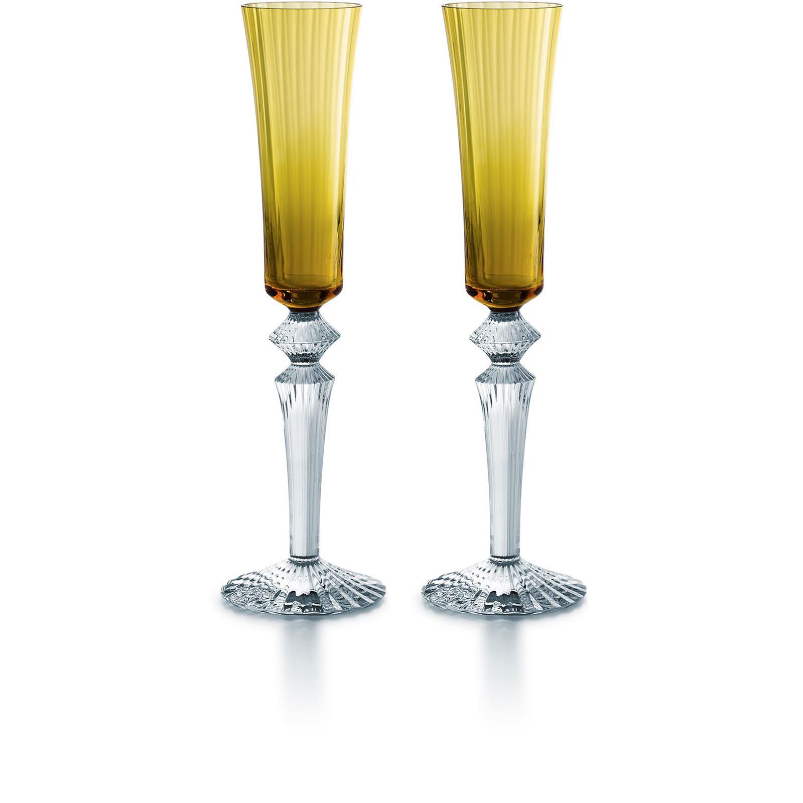 The name Mille Nuits is a reference to the 1001 Tales of The Arabian Nights and to the world of the Orient. The –issimo suffix emphasizes the design's overall sleekness. The smooth narrow bowl contrasts with the intricacy of the beveled stem: the detailing travels all the way down to the ridged foot. The two halves are united by the elegant diamond-shaped center, which is the Mille Nuits signature. In addition to the Clear crystal, the Flutissimo is also available in a variety of vivid colors.