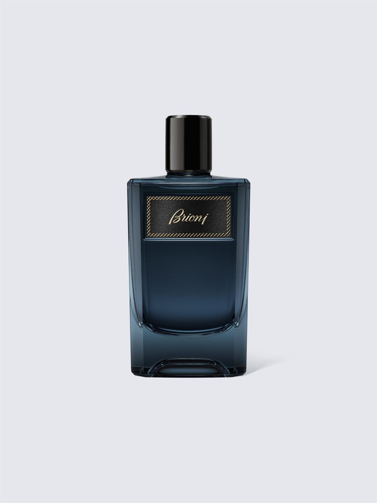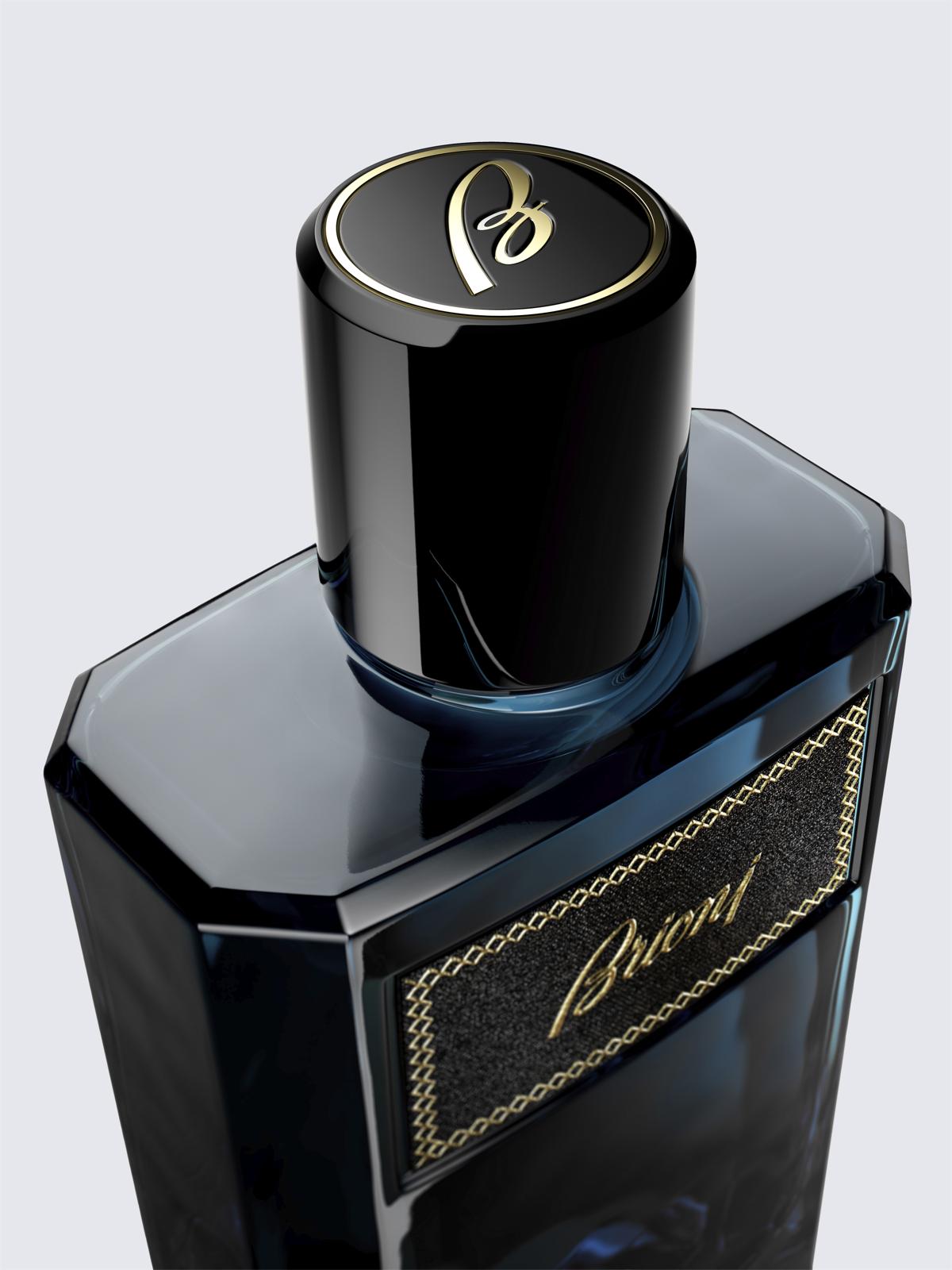 The timeless shape, made of heavy navy-blue Italian glass, is inspired by the Brioni tailored suits. Enriched by a satin label with golden cross-stitching details and a magnetic cap with our emblematic "B".