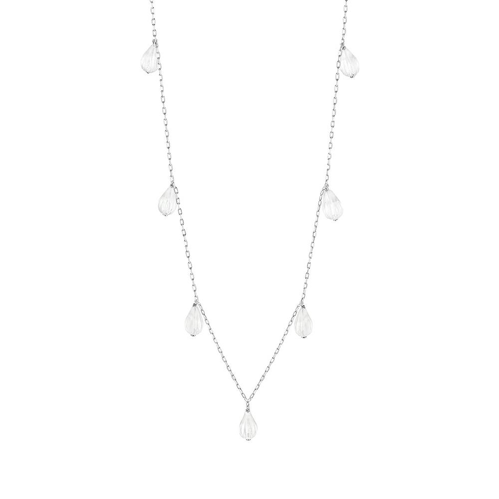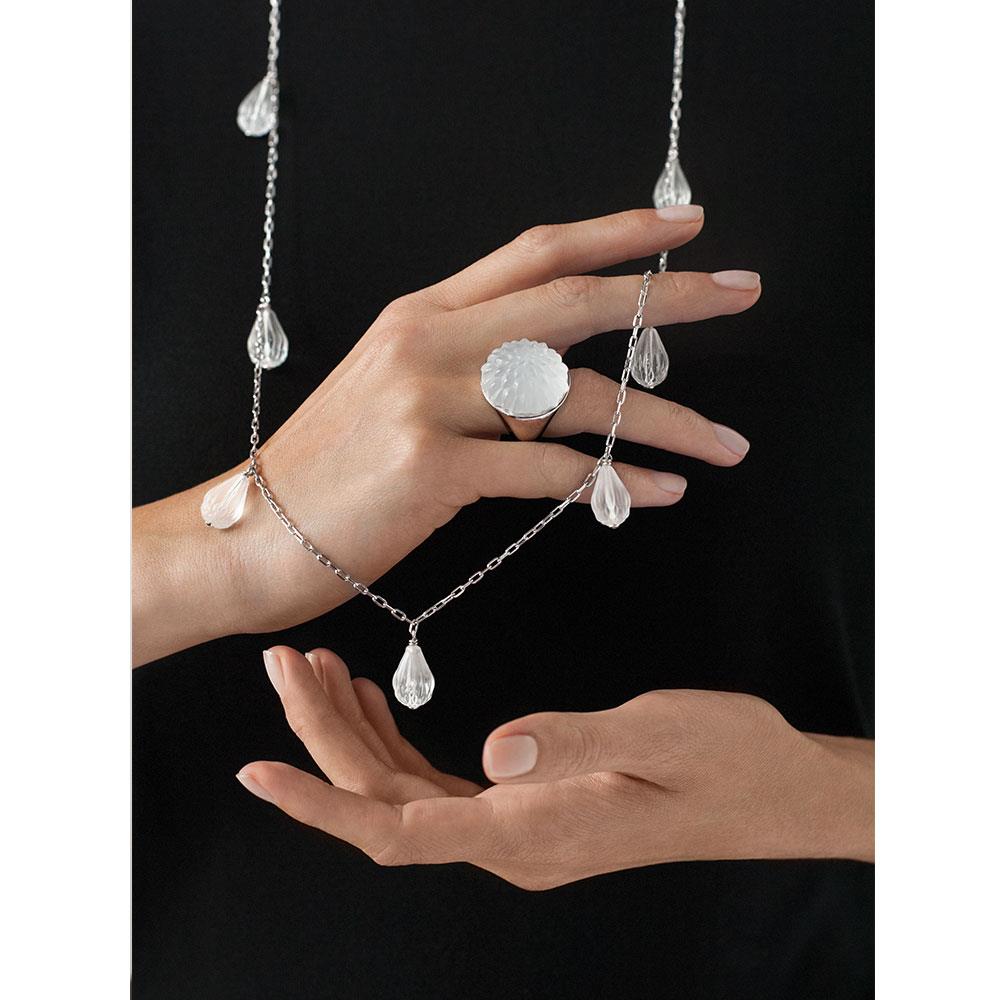 The flower petal pattern symbolizes a graphically styled bud poised to bloom, echoing the Art Deco heritage of the House. The design is available in an oversize ‘accessory’ style or in a dropped motif version, as stations on a long necklace or as a single element.