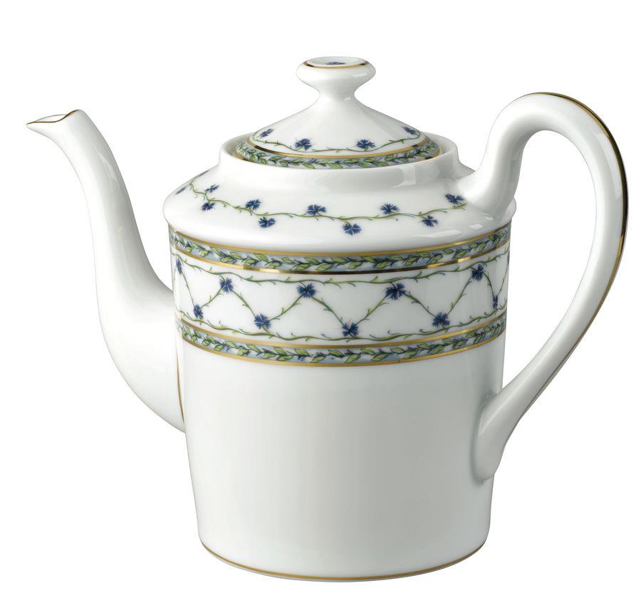 The “Allée du Roy” is one of Raynaud's classic collections, inspired by the French 18th century, which saw the creation of myriad china designs dedicated to the King and his court. A trellis entwined with leaves and cornflowers between crowns of laurels features on all pieces of the service in shades of blue and green. This frieze is finished by a central medallion of cornflowers, completing and balancing the design. Gold threads encircle and enhance the motif, as in the traditional designs of the Manufacture de Sèvres, the King's only china supplier of the time.