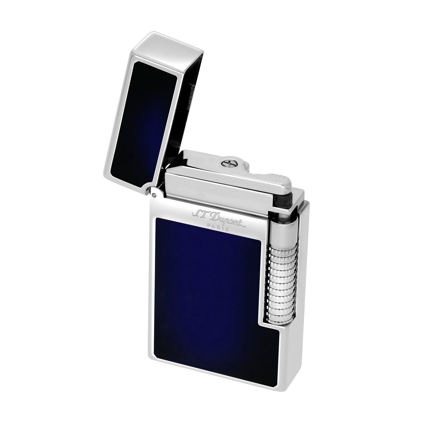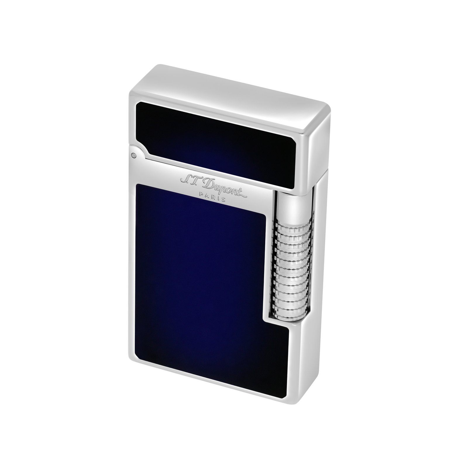Grand Dupont lighter, decorated with blue lacquer and palladium finish. Equipped with a dual ignition system: yellow flame or blue flame. Associated lighter stone: red (REF 900651) Associated gas refill: red (REF 900435) Lighter delivered empty of gas, refill sold separately. Screwdriver included to change the stone.