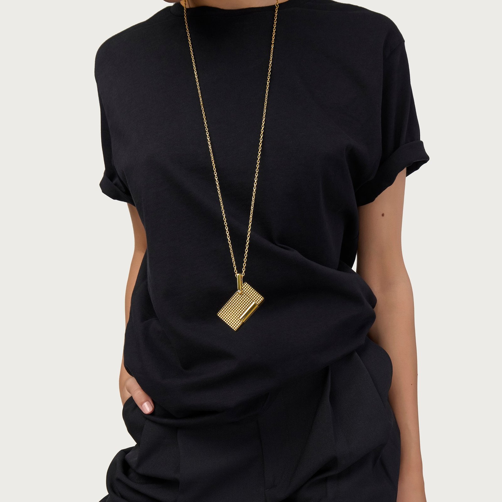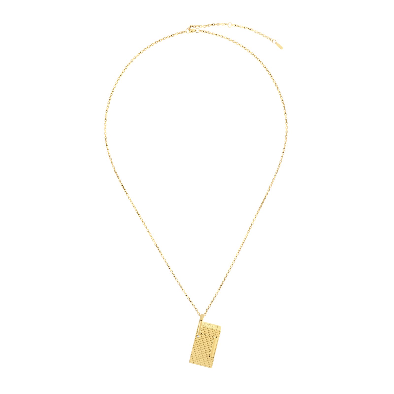 Lighter necklace in iconic diamond guilloche and gold finish. Removable and adjustable chain in three different lengths 80/85/90cm. Associated gas refill: black 000430 Lighter delivered empty of gas, refill sold separately.